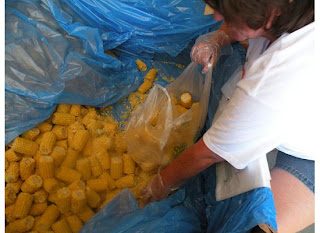 And Beth J., Kathy, and Megan ended up working in the warehouse most of the day - bagging thousands of pounds of donated corn and potatoes for people to take home for their Fourth of July weekend! (Ask Kathy or Beth about the corn and they will likely break into a fit of giggles!) This seemed like hot, dirty, menial work to do all day long - but when we put it into perspective of how we are able to serve others... It was definately worth spending the day this way. (And we got to meet several of the people who picked up the food - all very kind, friendly, warm-hearted individuals!)